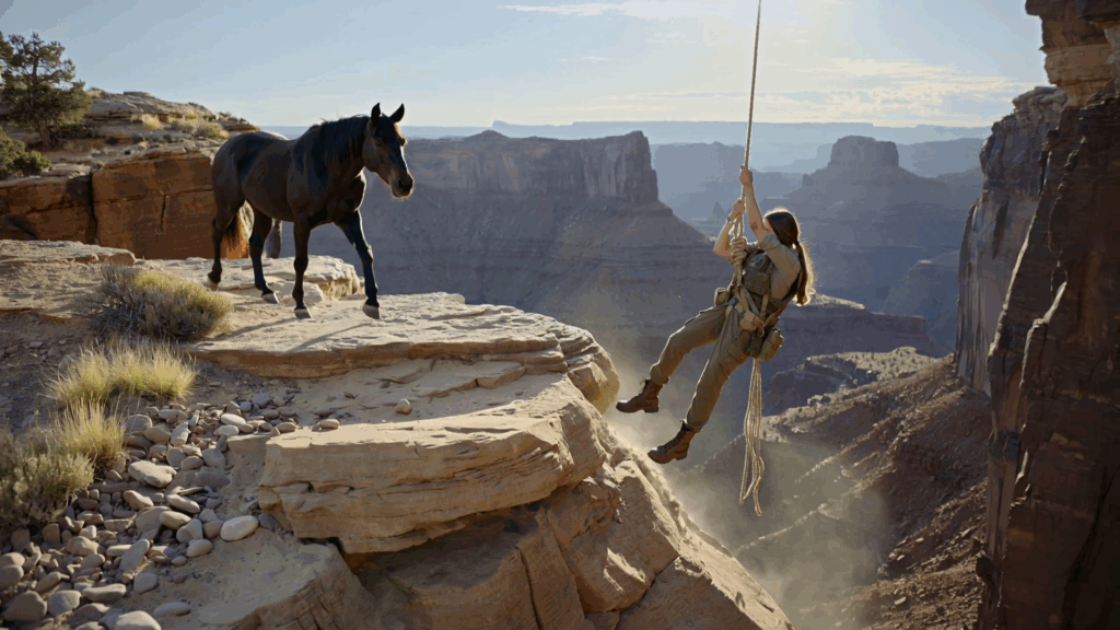 Lena’s entire body trembled, each jolt tugging on the precarious rope. She wanted to shout anything to get the horse’s attention, though it already seemed fixated on the rope. The mustang snorted, stomping a front hoof with a dull thud on the dusty rock. Lena let out a faint whimper, trying to form the word “help,” but her cracked lips barely managed to whisper. Yet the horse’s ears swiveled. Somehow it had heard that fragile note.