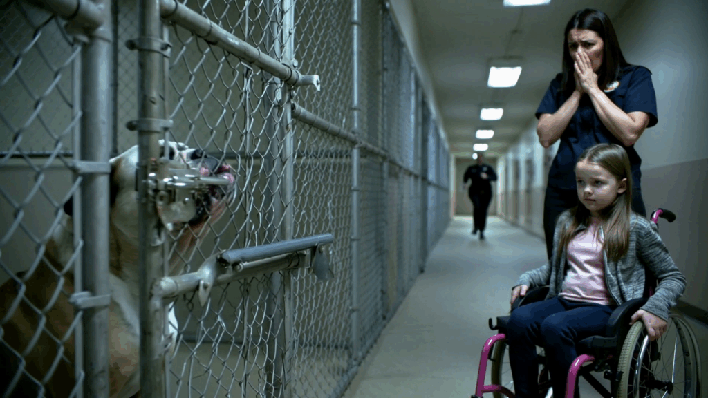 Mia rolled to the end of the aisle without being asked. She did not press her fingers to the bars. She did not whisper yet. She sat and waited until the dog looked at her, curious and afraid and pretending otherwise.
