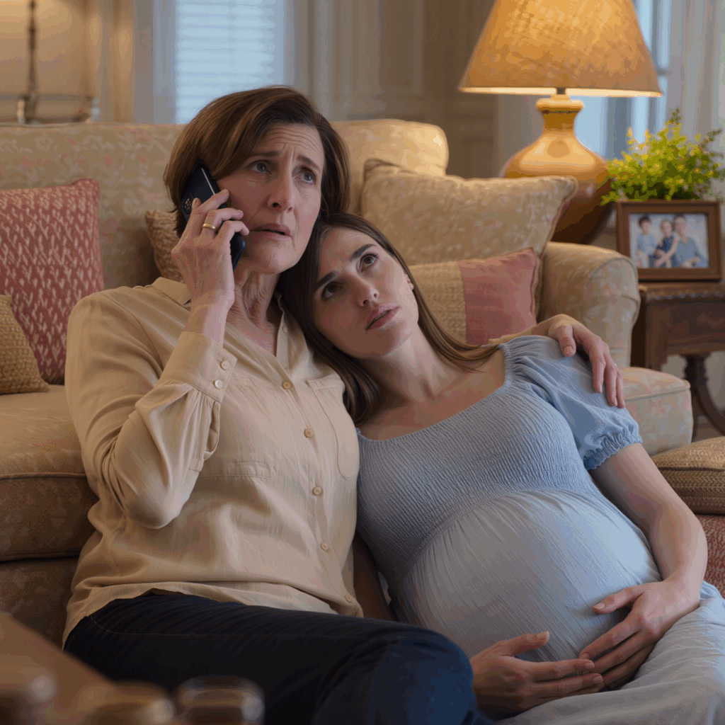 I found her on the living room rug, crumpled beside the gray sofa, one hand tucked under her cheek, the other splayed over her seven-month belly like she could keep the world from sliding off. Her face had the color no one should wear—drained candlewax. Her lips moved, but no sound came.