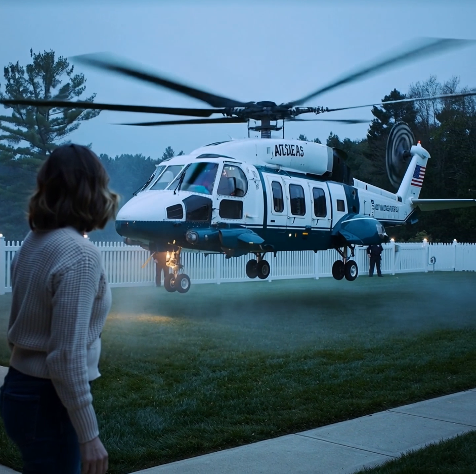 At first it was a dream, her subconscious blending rotors with rain. Then the picture frames rattled on the wall and her little house, the one with the crooked front step and the herb garden that never quite took, filled with a muscular wump‑wump‑wump. She pulled the curtain back and saw a shape lowering into the empty field beyond her backyard—the white and green she’d seen a hundred times on television but never expected to see reflected in her own window. UNITED STATES OF AMERICA ran along the fuselage, as inevitable as a sentence in a book that’s already been written.